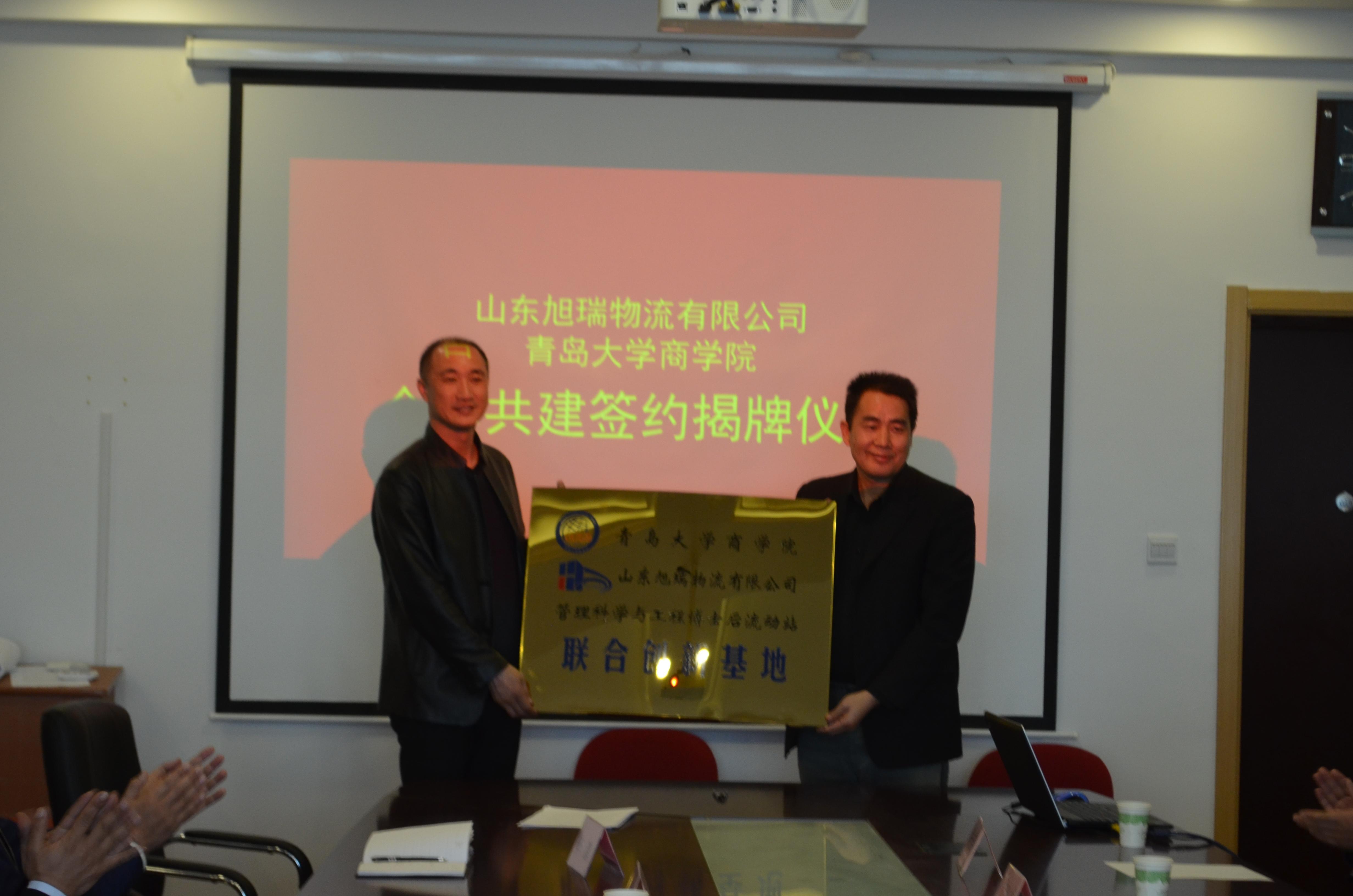 必赢76net线路官网院长胡劲松与徐建春签署合作共建协议,共同为必赢76net线路官网-山东旭瑞物流有限公司管理科学与工程博士后流动站联合创新基地、必赢76net线路官网旭瑞现代物流研究所揭牌。