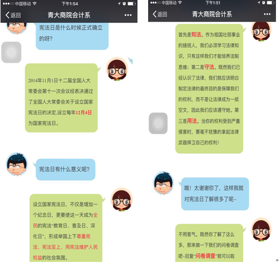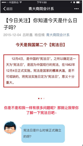 12月4日是国家宪法日。为贯彻落实党的十八届四中全会精神,积极开展宪法教育,大力弘扬宪法精神,根据我校《关于开展国家宪法日主题教育活动的通知》,必赢76net线路官网会计学系团总支开展了问卷调查、宪法知识小百科、争做遵纪守法先锋党员座谈会等活动,在我系学生中产生良好的反响。
