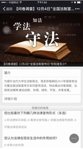 利用我系的微信平台,在微信上进行了关于宪法知识的调查问卷,同学们积极答卷,从而根据数据分析探讨,何种形式的普法宣传更受当代大学生的喜爱和接收。