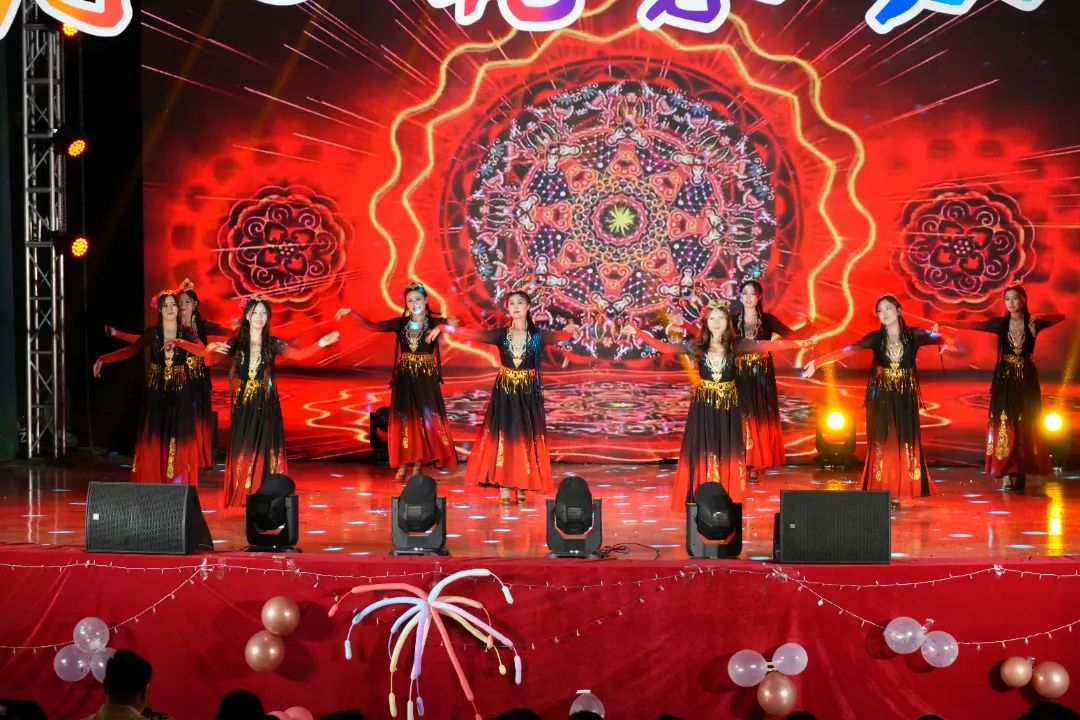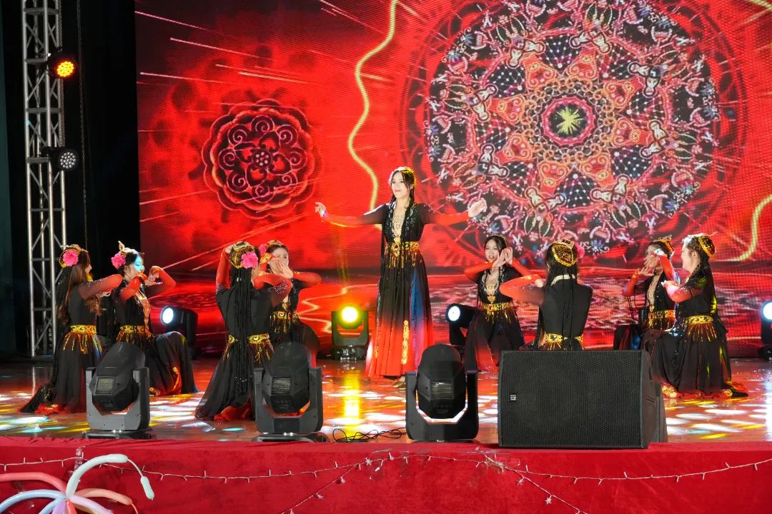 充满新疆风味的音乐响起,几名来自新疆的同学在舞台上翩翩起舞。活泼的舞姿、华丽的服装深深吸引着每一个观众,现场能感受到一种源自血脉中喷薄而出的力量,震撼心灵。