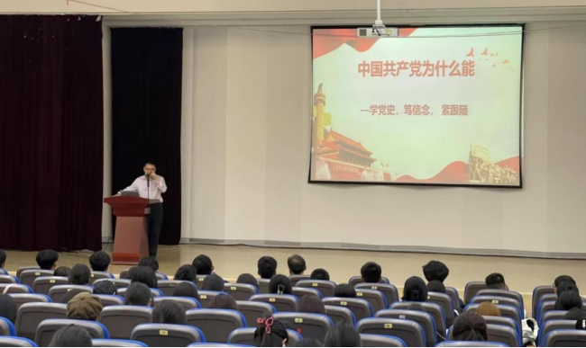 魏强老师围绕“中国共产党为什么能”这一主题开展入党启蒙教育,强调同学们要“学党史,笃信念,紧跟随”。他讲述了习近平总书记对青年大学生的期望与要求,希望同学们“要实学实干,脚踏实地,埋头苦干,孜孜不倦,如饥似渴,在攀登知识高峰中追求卓越,在肩负时代重任时行胜于言,在真刀真枪的实干中成就一番事业。”