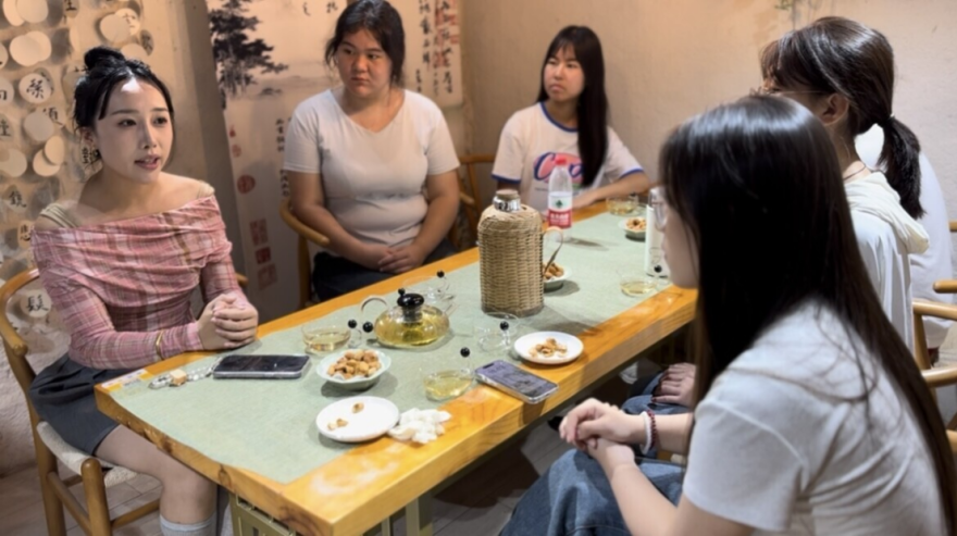 随后,实践团前往“半亩山塘”实地考察。一行人先后走访了茶艺区、禅修空间和特色民宿,仔细查看各区域的设施配置、功能布局和运营情况。在茶艺区,成员们了解了茶具摆放规范、茶饮定价标准及日常运营流程。