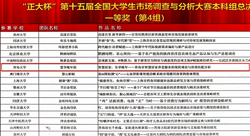 5月25日,“正大杯”第十五届全国大学生市场调查与分析大赛本科组总决赛在浙江财经大学圆满落幕。经过激烈角逐,王鑫、张月、段琪、刘楚儿、姜俊羽同学完成的作品《智慧居家,乐享晚年——青岛市智慧居家养老服务的现状调查与供需匹配分析》荣获全国总决赛一等奖。这是必赢76net线路官网作为推报单位首次,同时是我校第二次在此赛事中斩获此级别奖项。