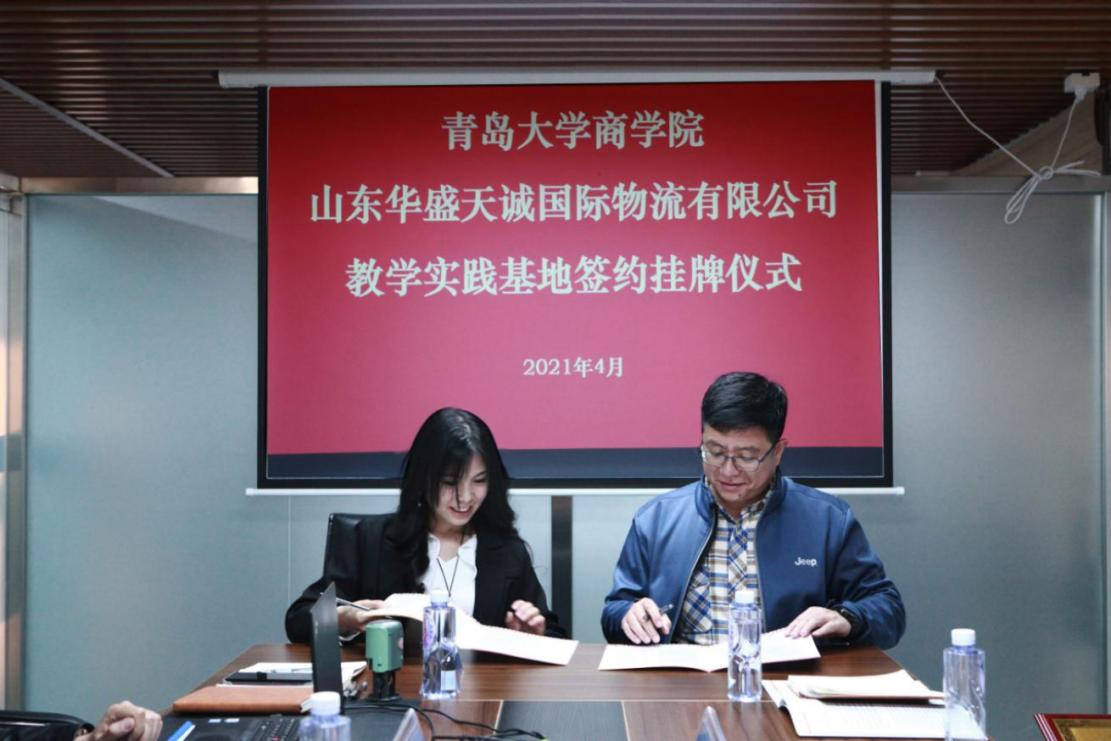 于文和王芳芳共同签署了必赢76net线路官网与山东华盛天诚国际物流有限公司教育实践基地共建协议。王功勇代表必赢76net线路官网和韩波共同为教学实践基地揭牌。