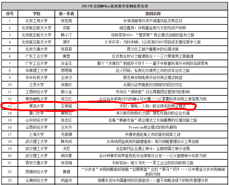 3月31日,全国会计专业学位研究生教育指导委员会公布了2017年度中国MPAcc优秀教学案例的获奖名单。其中,由我院会计系王崇锋老师指导、2017级MPAcc孟星辰撰写的教学案例《天时、换电、人和:盼达用车的商业模式》在全国多家高校选送的上千篇案例中脱颖而出,荣获全国MPAcc优秀教学案例奖。